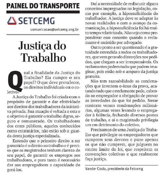 Qual a finalidade da Justiça do Trabalho? Ela cumpre o seu papel? O que deve prevalecer, os direitos individuais ou o coletivo? O presidente da Fetcemg, Vander Costa, debate o tema em artigo publicado no jornal O Tempo de segunda-feira (6). Confira!