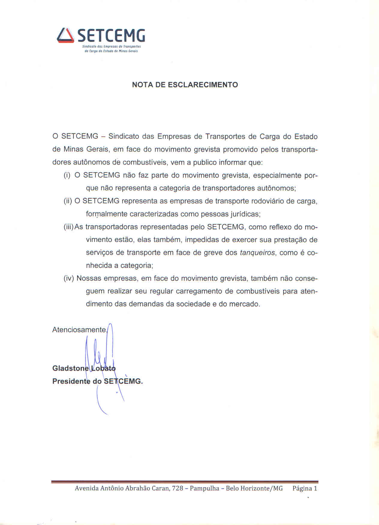 O SETCEMG – Sindicato das Empresas de Transportes de Carga do Estado de Minas Gerais, em face do movimento grevista promovido pelos transportadores autônomos de combustíveis, vem a publico informar que: