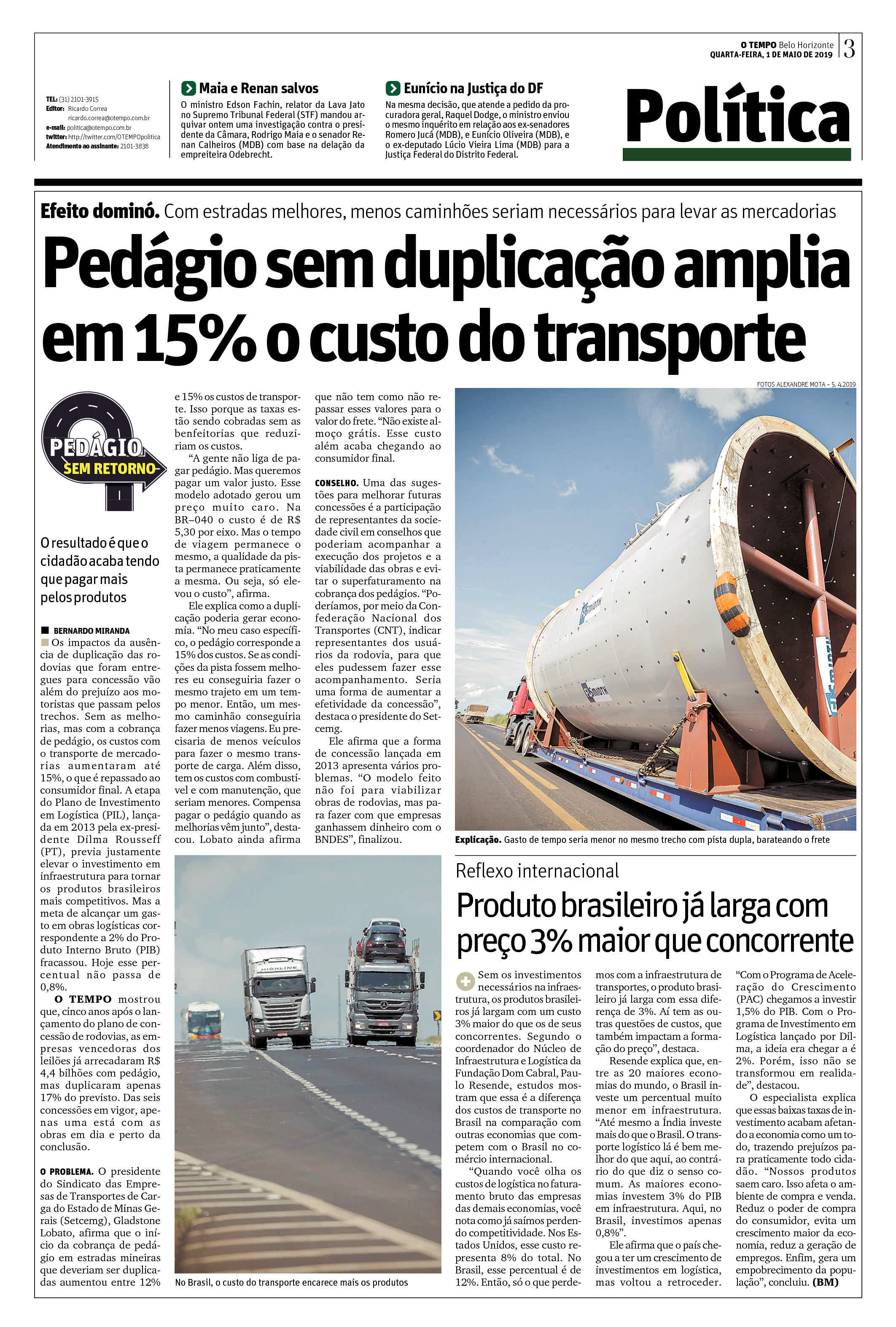 O problema. O presidente do Sindicato das Empresas de Transportes de Carga do Estado de Minas Gerais (Setcemg), Gladstone Lobato, afirma que o início da cobrança de pedágio em estradas mineiras que deveriam ser duplicadas aumentou entre 12% e 15% os custos de transporte. Isso porque as taxas estão sendo cobradas sem as benfeitorias que reduziriam os custos.